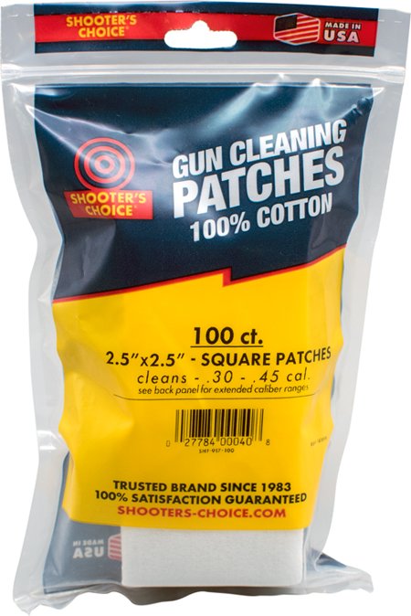 Includes 100 2.5 inch square patches Shooter’s Choice 100 cotton square gun cleaning patches are not only more absorbent, but will not leave streaks in your barrel.