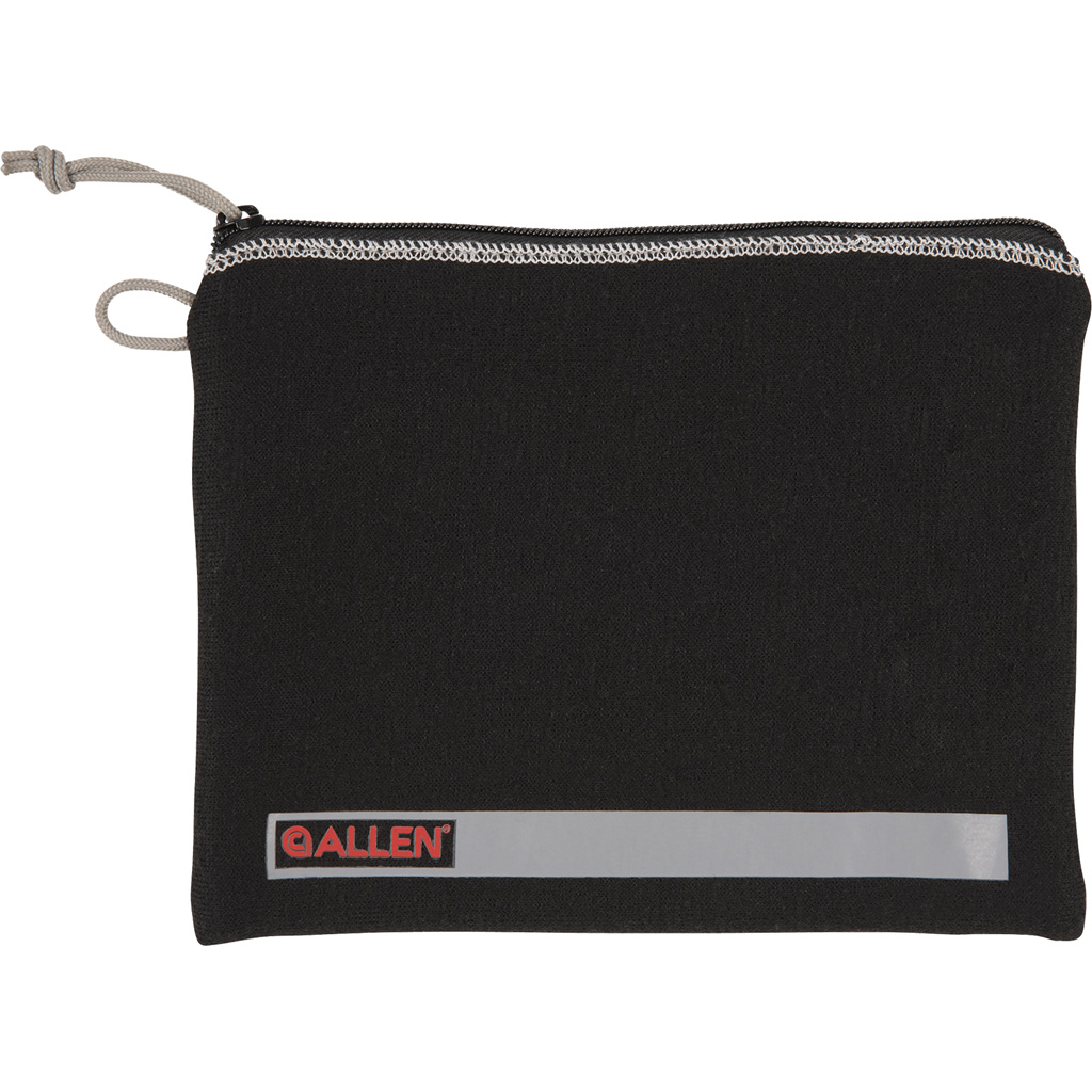 A soft handgun case with durable polyester interior and exterior. Fits handguns 7-9 inches. Features a front zippered pocket for cleaning tools, magazine, or other range essentials. The interior muzzle pocket helps keep the pistol in place during transport. Fits a small lock through the zipper pull and metal D-ring.