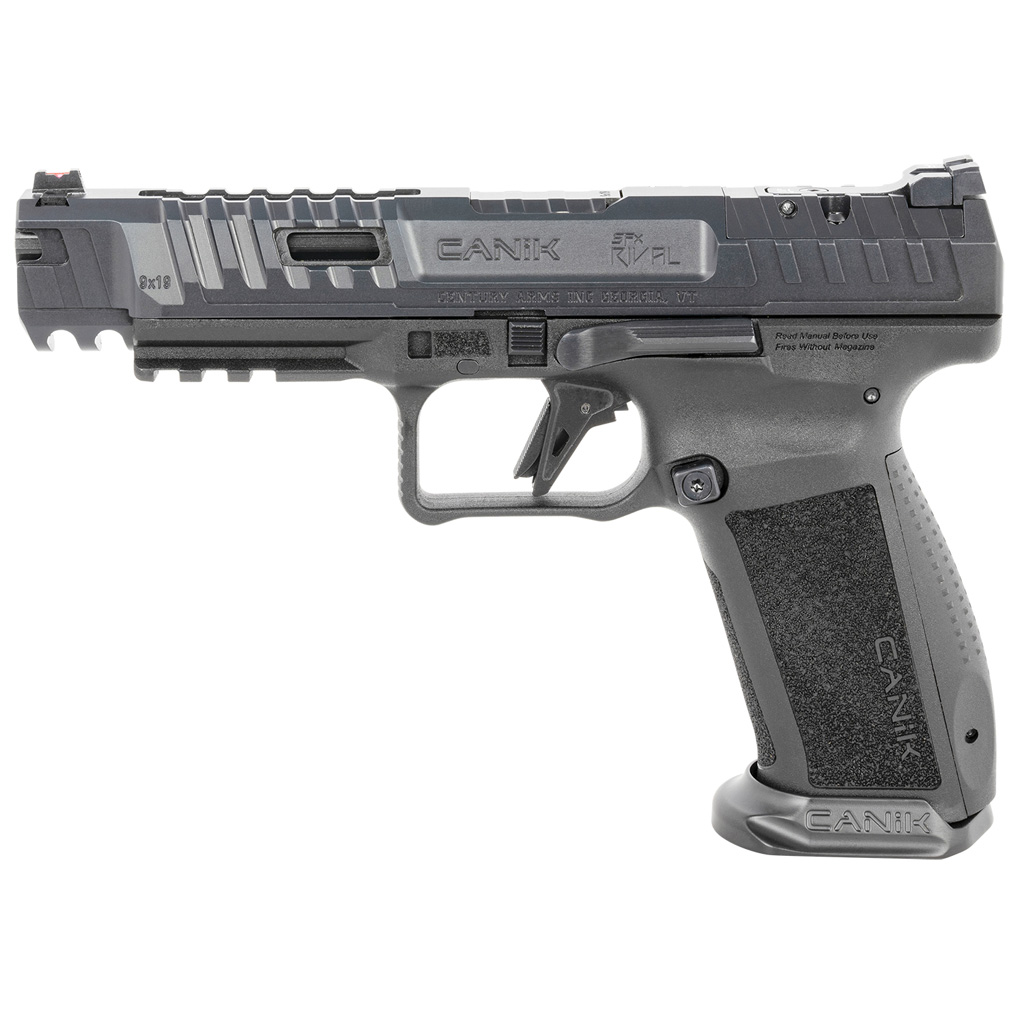 Canik is proud to introduce the next wave of superior handguns with the Canik Rival series. This revolutionary firearm was designed to level the playing field for the competitive shooter without breaking the bank! – The Canik SFx Rival has a total length of 8.1 a height of 5.7 a 1.41 width a 5 barrel and an overall weight of 29.5 oz. With these specifications the Canik SFx Rival can compete in IDPA IPSC and USPSA without restrictions. The Canik Rival is available in Canik Rival Grey with Cerakoted gold accents and in an all-black configuration called the Canik SFx Rival Dark Side. With adjustable fiber optic sights a lightened 90° diamond cut aluminum flat trigger reversible magazine releases and sizes ambidextrous slide release aggressively serrated and ported slide 1913 Picatinny rail external mag-well 3 grip back strap sizes double undercut trigger guard ergonomically redesigned beavertail aggressive grip texturing and a completely modular setup the SFx Rival is ready to win right out of the box! – Includes: – (2) 18 Round Magazines – (2) Aluminum Magazine Base Plates -Magazine Loader – External Mag-Well – Custom Holster – Canik Punch & Tool Kit – Cleaning Kit – (4) Optic Plates for RIVAL – (5) Optic Plates for RIVAL DARK SIDE – Additional Fiber Optic – (3) Grip Back Straps – (3) Magazine Release Extensions – Gun Lock & Manual – Specifications – WEIGHT: 29.5 oz – CAPACITY: 18+1 rounds – FRONT SIGHT: Fiber Optic – CARTRIDGE: 9mm Luger – MAGAZINE TYPE: Canik Full Size Magazine – REAR SIGHT: Adjustable – MAGAZINE INCLUDED: 2x 18 Round Magazines – FINISH COLOR: Rival Grey or Rival Dark Side – ACTION TYPE: Semi-Automatic – FRAME MATERIAL: Synthetic – OVERALL LENGTH: 8.1 – BARREL LENGTH: 5 – HEIGHT: 5.7 – WIDTH: 1.41 – MANUFACTURED: Made in Turkey